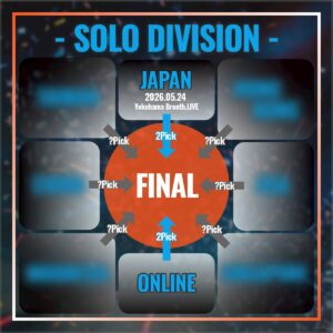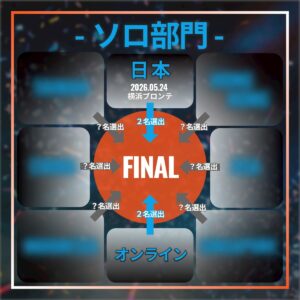 原則として1名ですが、地域のレベル等を考慮し、複数名の選出枠を設ける可能性もございます。また、日本予選およびオンライン予選の選出枠は2名です。最終的な選出枠は、各地域予選の詳細と合わせて発表されます。ソロ部門の全体像は下記の画像をご確認ください。